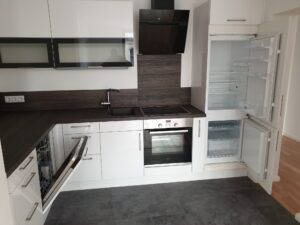 Die Wohnung befindet sich im Erdgeschoss des Hauses und ist mit einem Laminatboden und einer modernen Einbauküche ausgestattet.