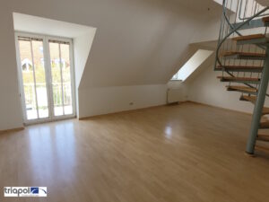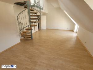 Die helle und freundliche Maisonettewohnung befindet sich im Dachgeschoss des Hauses, verfügt über einen Balkon und ist mit einem Laminatboden ausgestattet. Das neu sanierte und modern geflieste Bad verfügt über eine Dusche und einen WM-Anschluss. Das Wohn- und Schlafzimmer sowie das Bad und die Küche sind vom Flur begehbar. Der Balkon ist vom Wohnzimmer aus erreichbar. Ebenfalls vom Wohnzimmer aus ist die obere Etage über eine Wendeltreppe zu erreichen. Auf der oberen Etage befindet sich neben dem Galeriezimmer ein großzügiger Abstellraum bzw. Schrankraum.